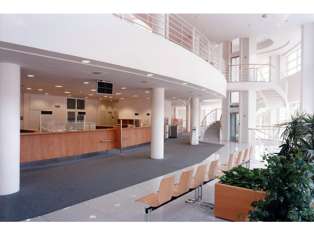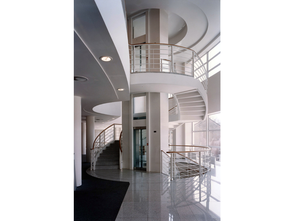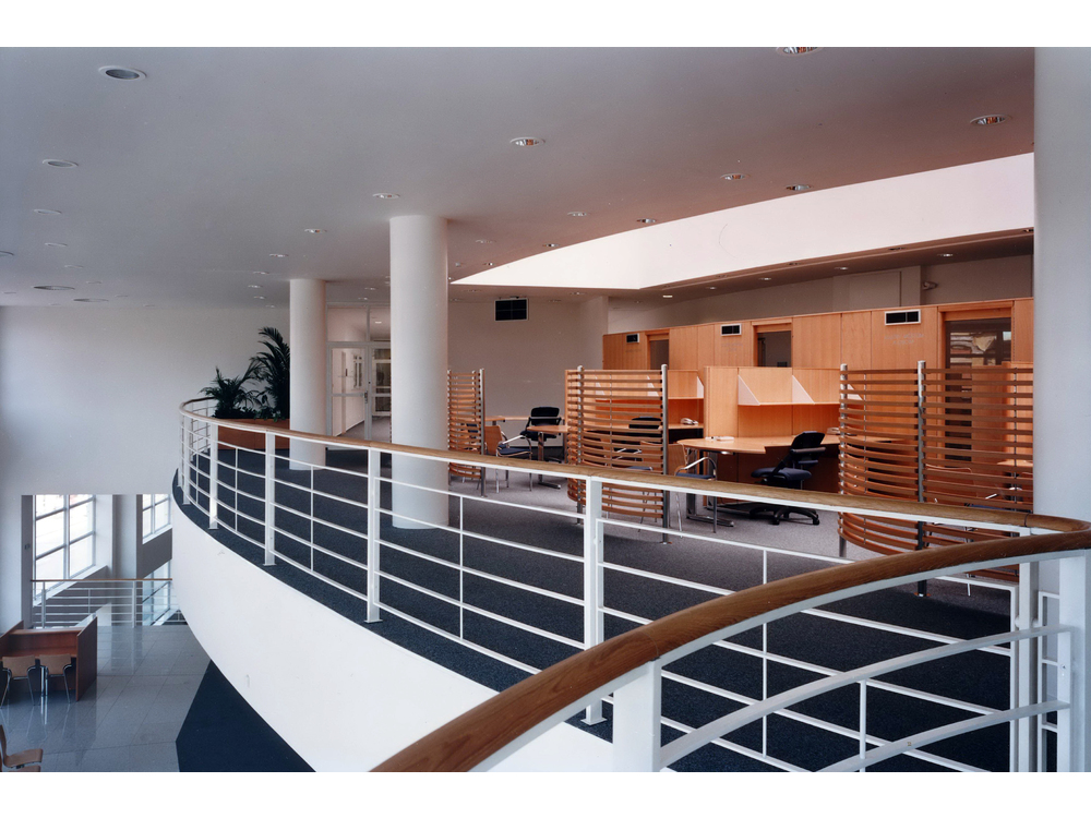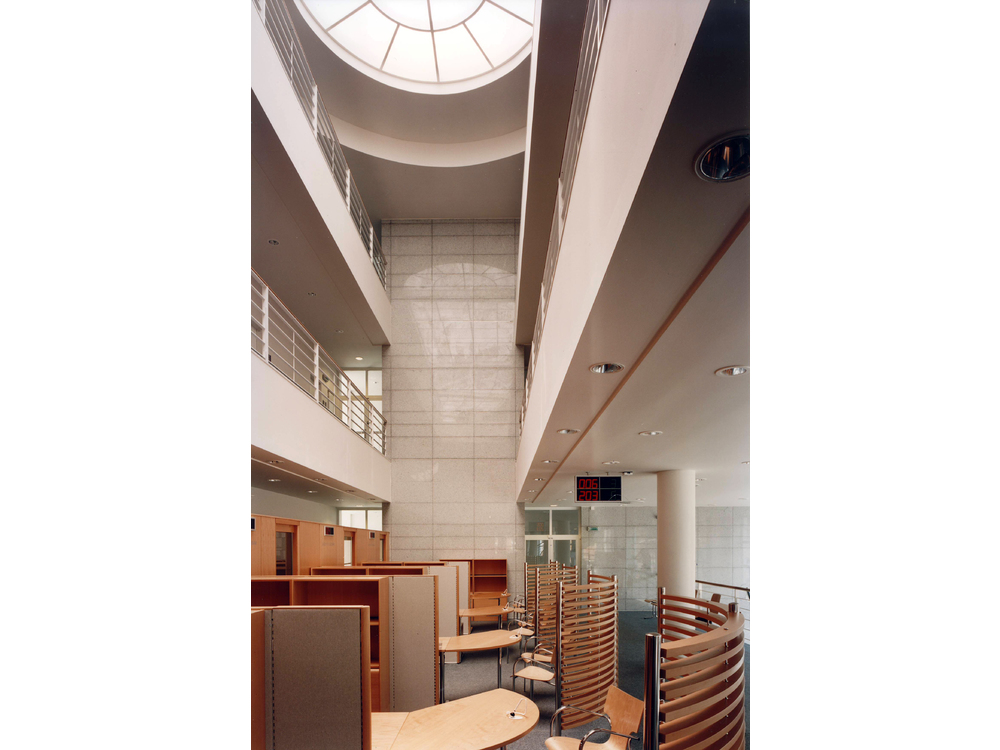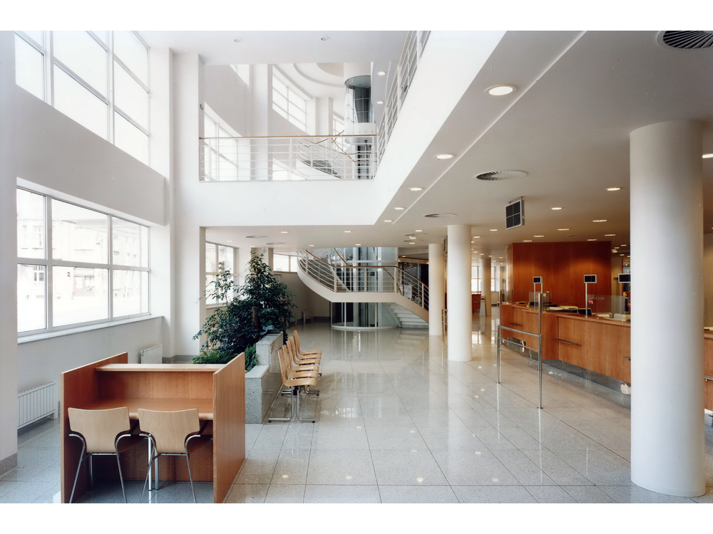 Sídlo bankovní instituce je segmentově rozloženo mezi dvě frekventované městské ulice. Kopíruje tvar křižovatky a proud dopravy v její blízkosti. Budova byla koncipována jako jeden volný halový prostor vzájemně se prolínající v jednotlivých podlažních úrovních a vytvářející tak zajímavé průhledy od nejnižší části vstupu až po centrální světlík ve stropní konstrukci. Pracoviště jsou volně rozmístěna na jednotlivých galeriích, administrativní zázemí je odděleno do samostatných kanceláří. Výrazným architektonickým prvkem bankovní haly je kruhové schodiště doplněné panoramatickým proskleným výtahem. Jeho situování v blízkosti skleněné fasády umožňuje vnímat dynamiku budovy, zejména pak po setmění, kdy je celý interiér rozsvícen a budova se tak stává transparentní do veřejného prostoru.
