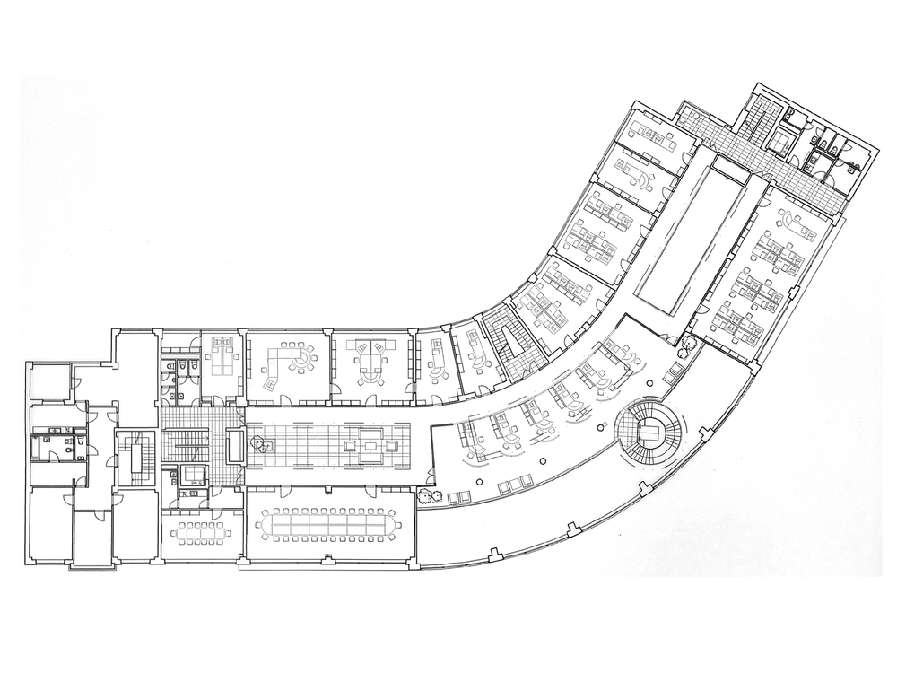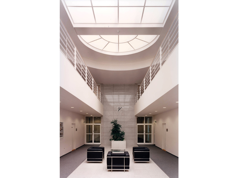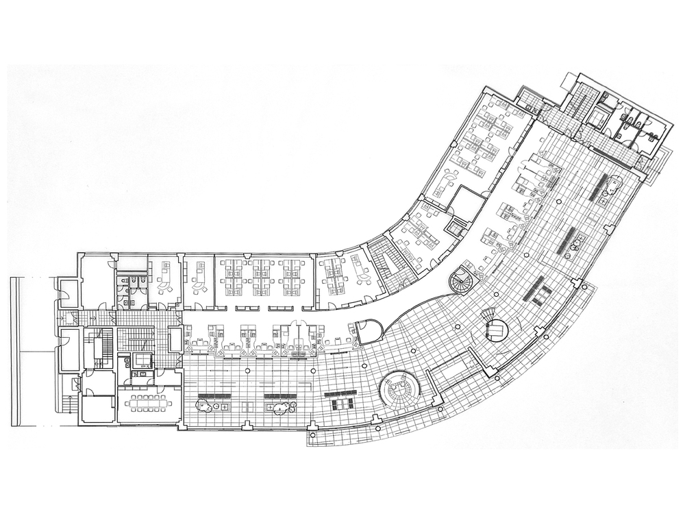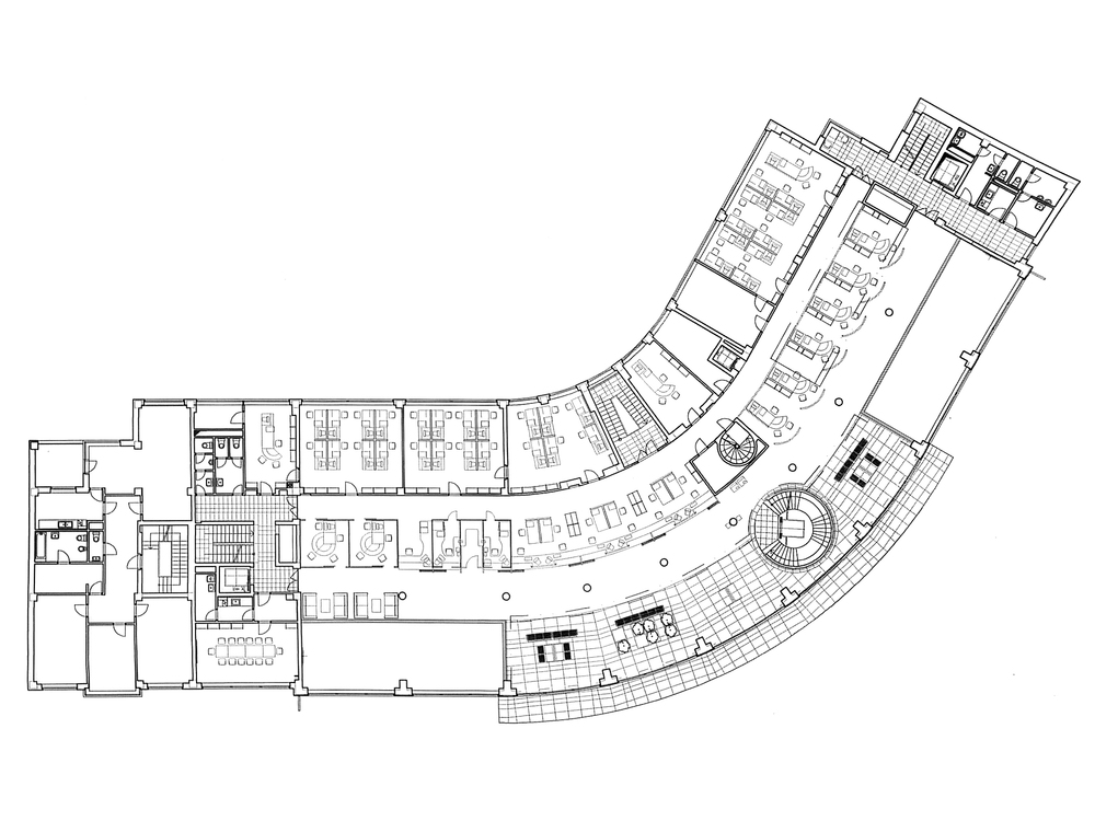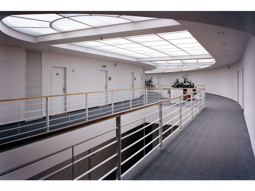 Sídlo bankovní instituce je segmentově rozloženo mezi dvě frekventované městské ulice. Kopíruje tvar křižovatky a proud dopravy v její blízkosti. Budova byla koncipována jako jeden volný halový prostor vzájemně se prolínající v jednotlivých podlažních úrovních a vytvářející tak zajímavé průhledy od nejnižší části vstupu až po centrální světlík ve stropní konstrukci. Pracoviště jsou volně rozmístěna na jednotlivých galeriích, administrativní zázemí je odděleno do samostatných kanceláří. Výrazným architektonickým prvkem bankovní haly je kruhové schodiště doplněné panoramatickým proskleným výtahem. Jeho situování v blízkosti skleněné fasády umožňuje vnímat dynamiku budovy, zejména pak po setmění, kdy je celý interiér rozsvícen a budova se tak stává transparentní do veřejného prostoru.