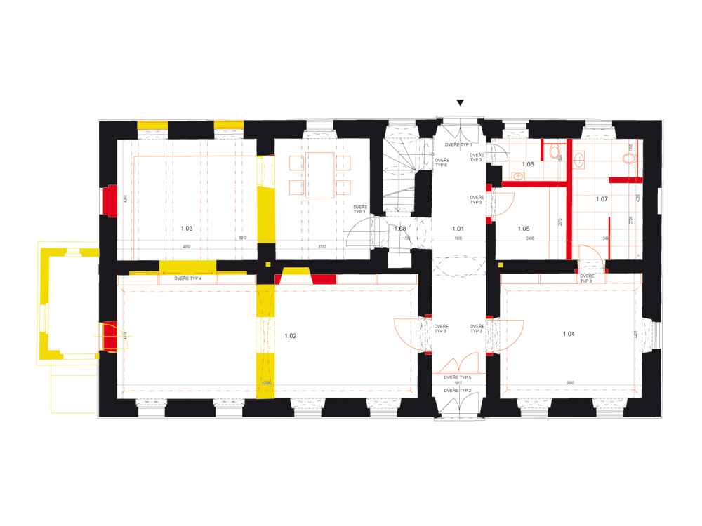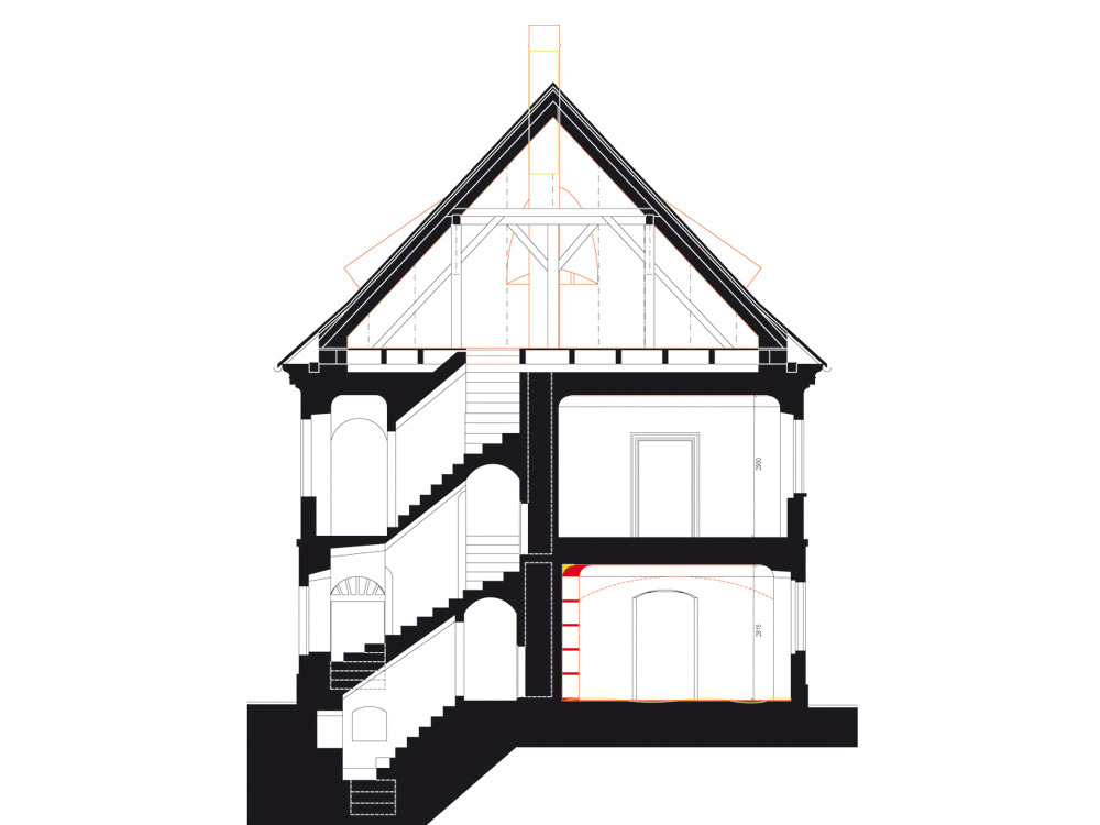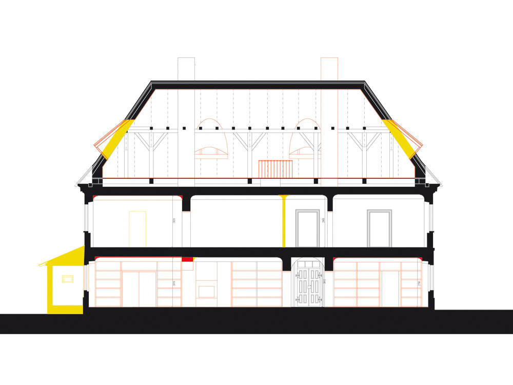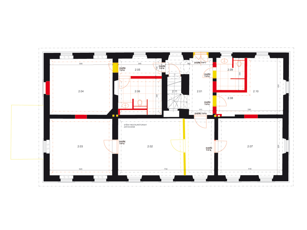 Cestou a cílem obnovy současného „holého“ torza bývalé fary se stala idea jedné výsledné souvislé struktury, která zahrnuje téměř veškerou dostupnou poškozenou substanci stavby a zároveň umožňuje přidání řady současných moderních prvků. Stavba a stavební interiér jsou koncipovány jako koláž. Tam, kde je to technicky i formálně možné přiznáváme historii, která se v domu projevuje například škálou profilace dveřních obložení (od barokních až po klasicistní), prolínáním vrstev výmaleb nebo v podlahových površích. Přestavba bude zahrnovat téměř až restaurátorskou obnovu, která by měla respektovat historickou strukturu v různých stavech její patiny. Zajímavým prostorem, jak vizuálně, tak vzájemným prosakování historických vrstev, je místnost budoucího salónu. Tento prostor, „galerie“, nese výrazné výtvarné působení prostoru a času.