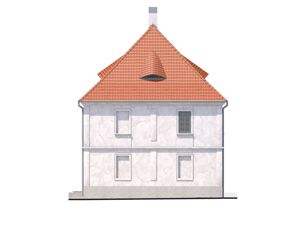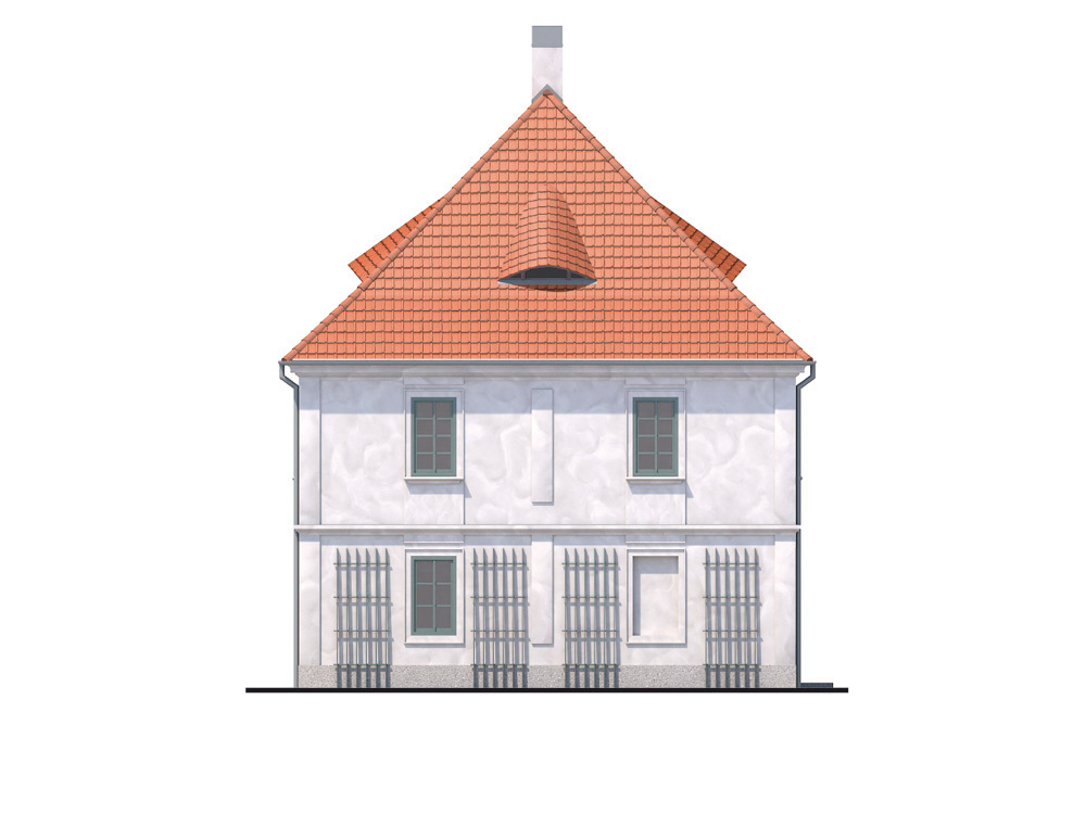 Nově navržená dispozice vychází z dispozice původní, kterou upravuje. Hlavní vnitřní nosná stěna v podélném směru rozděluje interiér na velkorysé prostory salonu, pracovny, velké jídelny, dětského a hostovského pokoje, které mají výhled na kostel a ložnici, stejně jako kuchyň s menší jídelnou, které jsou umístěny směrem do zahrady. Sklepní prostory slouží jako technická místnost a sklad potravin. Volný půdní prostor má funkci přirozeného tepelného štítu.