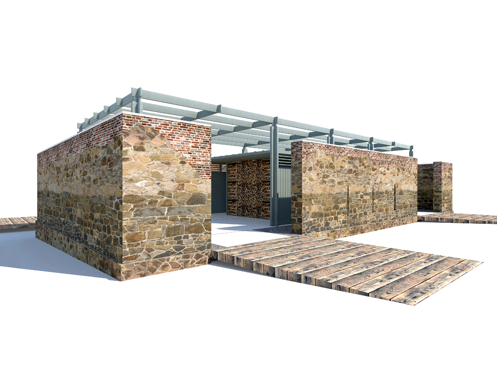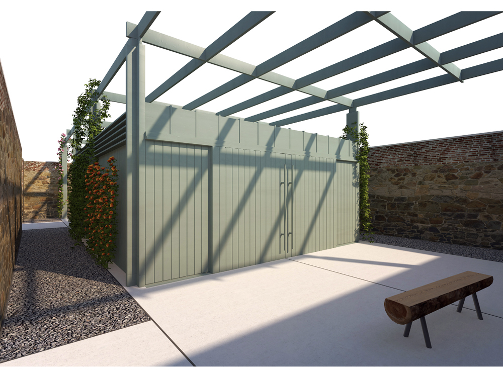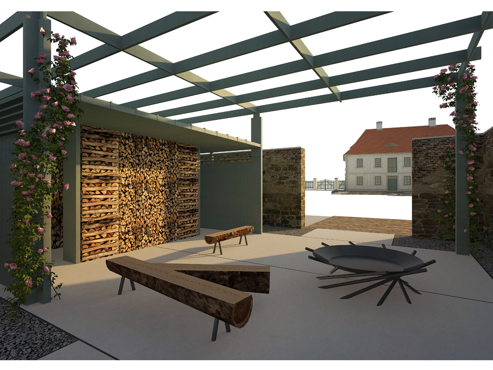 Zahrada tvoří přechod od obytné části do volné krajiny. Její koncepce je navržena v neformálním venkovském stylu s centrálním volným prostorem. V zahradě se nachází objekt nové stodoly. To, co zůstalo z původní stodoly (tj. obvodové stěny s různou mírou degradace), bylo staticky zajištěno, stabilizováno a opraveno. Původní torza kamenných stěn byla doplněna cihelnou nástavbou a zakončena betonovou korunní římsou v jednotné výšce. Pochozí povrch je navržen z jemného litého betonu v kombinaci s kamenivem. Hlavním motivem nové stodoly je překryv kovovou pergolou. Pod ní se nachází místo odpočinku, zahradních oslav a prostor pro uložení nářadí a zahradní techniky.